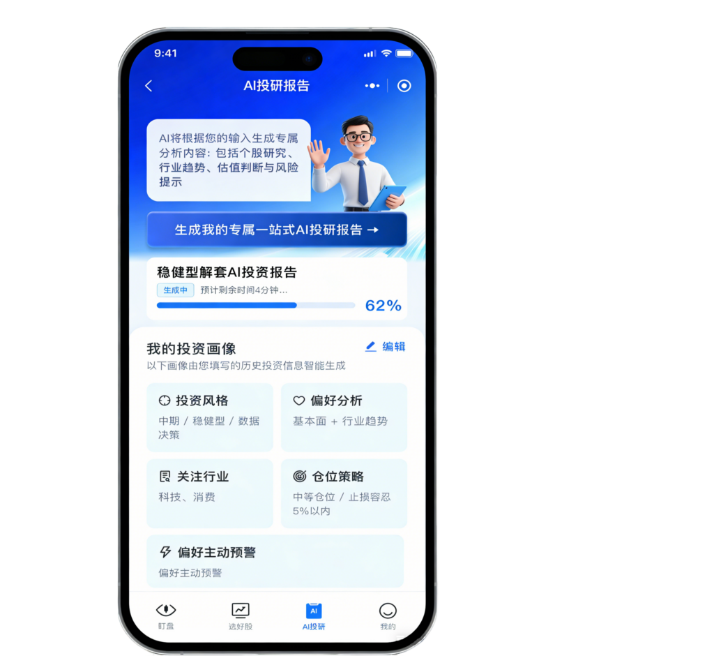 机构级 AI 投研能力普惠化,整合全市场研报、政策动态与产业数据,通过算法拆解热点产业链逻辑、量化分析事件影响,自动生成个股价值分析报告,用数据和专业研报支撑决策,让投资有迹可循。